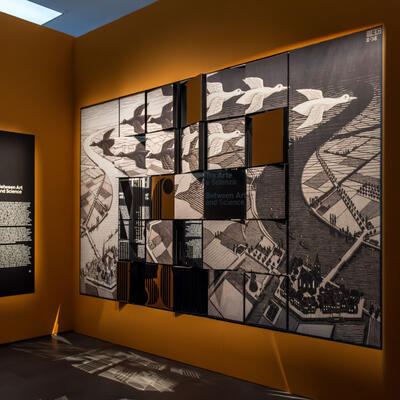 Known for his impossible architecture, optical illusions, tessellations, and metamorphoses, M.C. Escher created a unique visual language that combines art and mathematics. This mathematics is not based on the abstract reasoning of professional academics, but on long, meticulous, and passionate work, based on a more intuitive and perceptive approach. In Escher, art and science merge into a rigorous, inventive, and deeply personal vision, in a common thread that strongly characterizes the exhibition. With a new perspective, M.C. Escher. Between Art and Science also explores the influence of Islamic art—in particular the decorations of the Alhambra in Granada and the Mezquita in Cordoba—in the construction of the graphic universe that characterizes the Dutch artist's distinctive style.